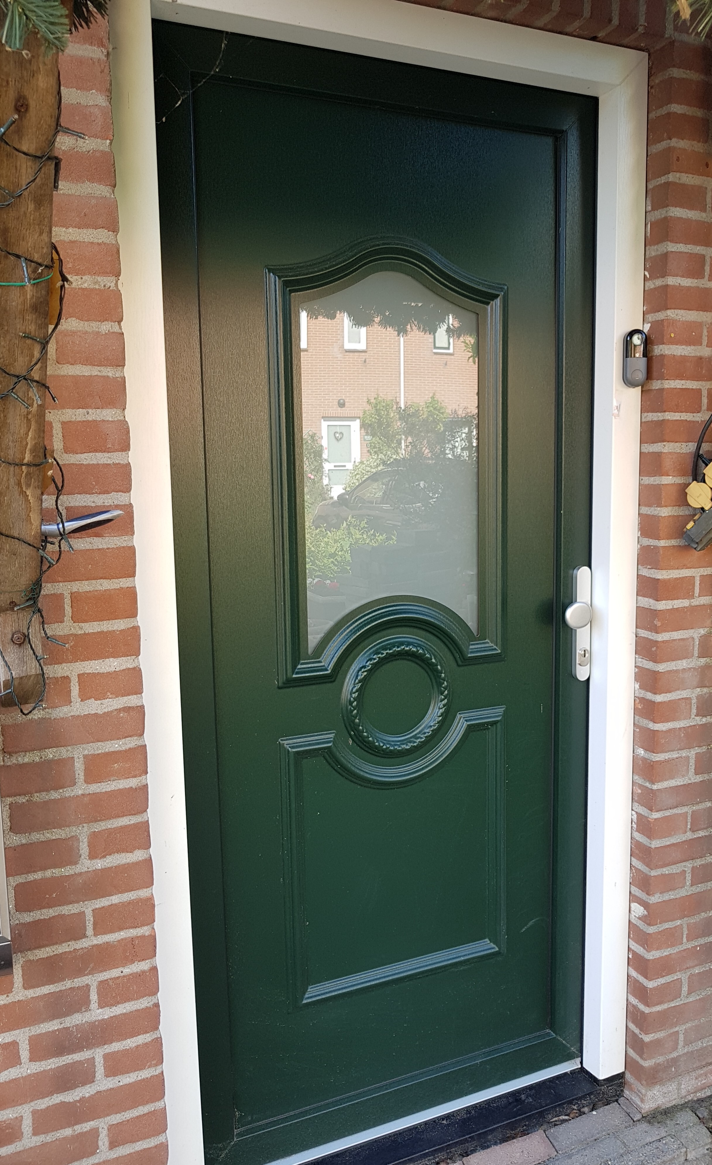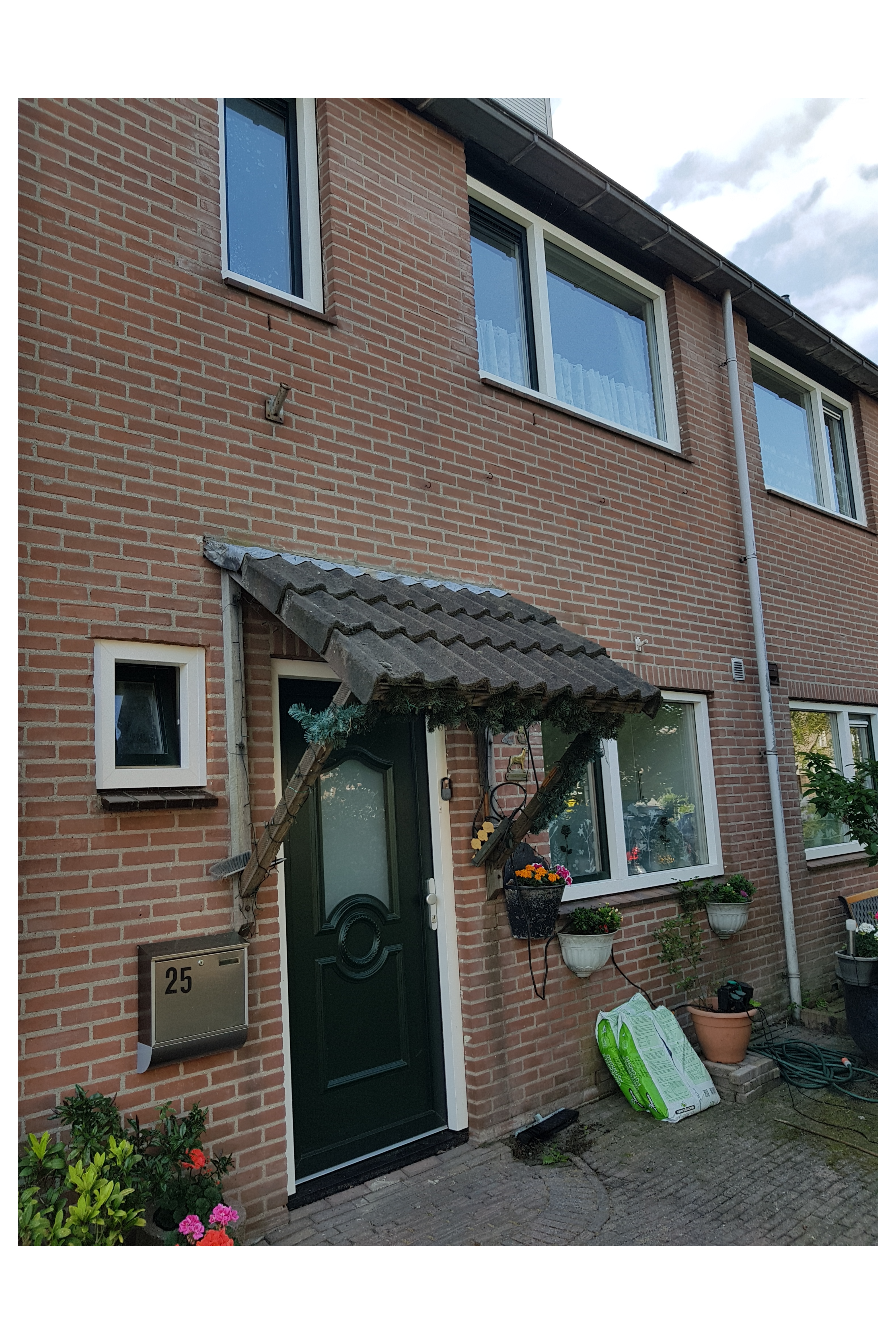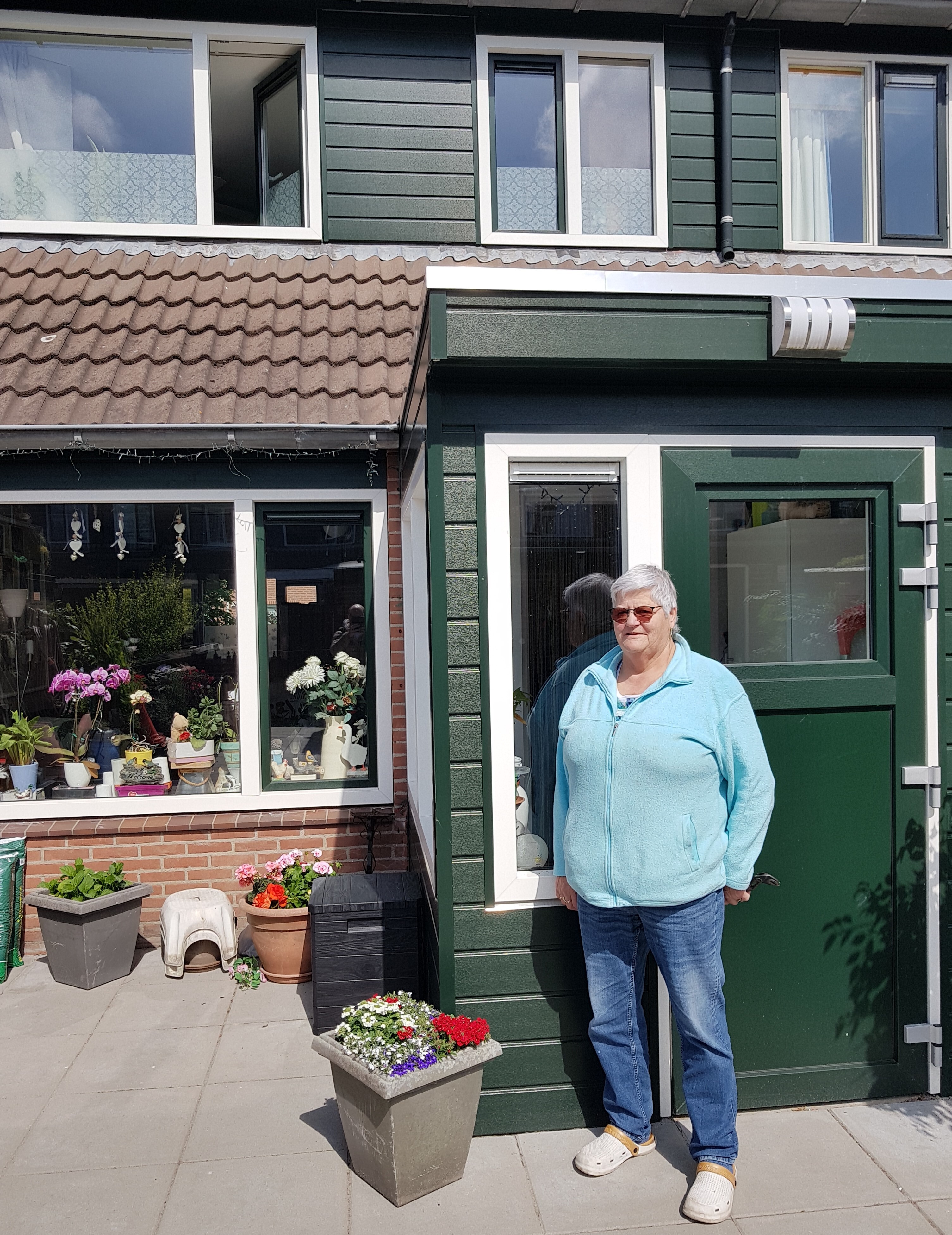 Verwijderen oude houten kozijnen en plaatsen en afwerken nieuwe kunststof kozijnen in een prachtige Grachten groene kleur gecombineerd met zacht wit (RAL 9010 voor de kenners). Het aanbouwtje waar de klant ook op de foto staat hebben we opnieuw opgebouwdt. Deze was van hout en begon flink te rotten. Nieuwe fundering gelegd, houtskelet opgebouwd en afgewerkt met Keralit in dezelfde kleur als de kozijnen. Keralit is een composiet gevelafwerking dat niet kan rotten en verkleuren. Samen met de kunststof kozijnen hoeft de klant er de komende 40 jaar niet meer aan te denken.