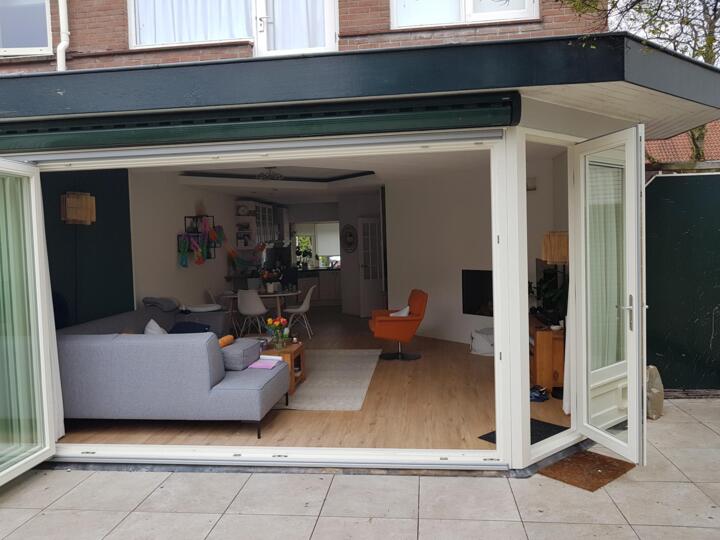 Prachtige hardhouten harmonicadeur in Hilversum. Harmonicadeuren hebben het grote voordeel dat ze, als het ware, als een harmonica in elkaar schuiven.